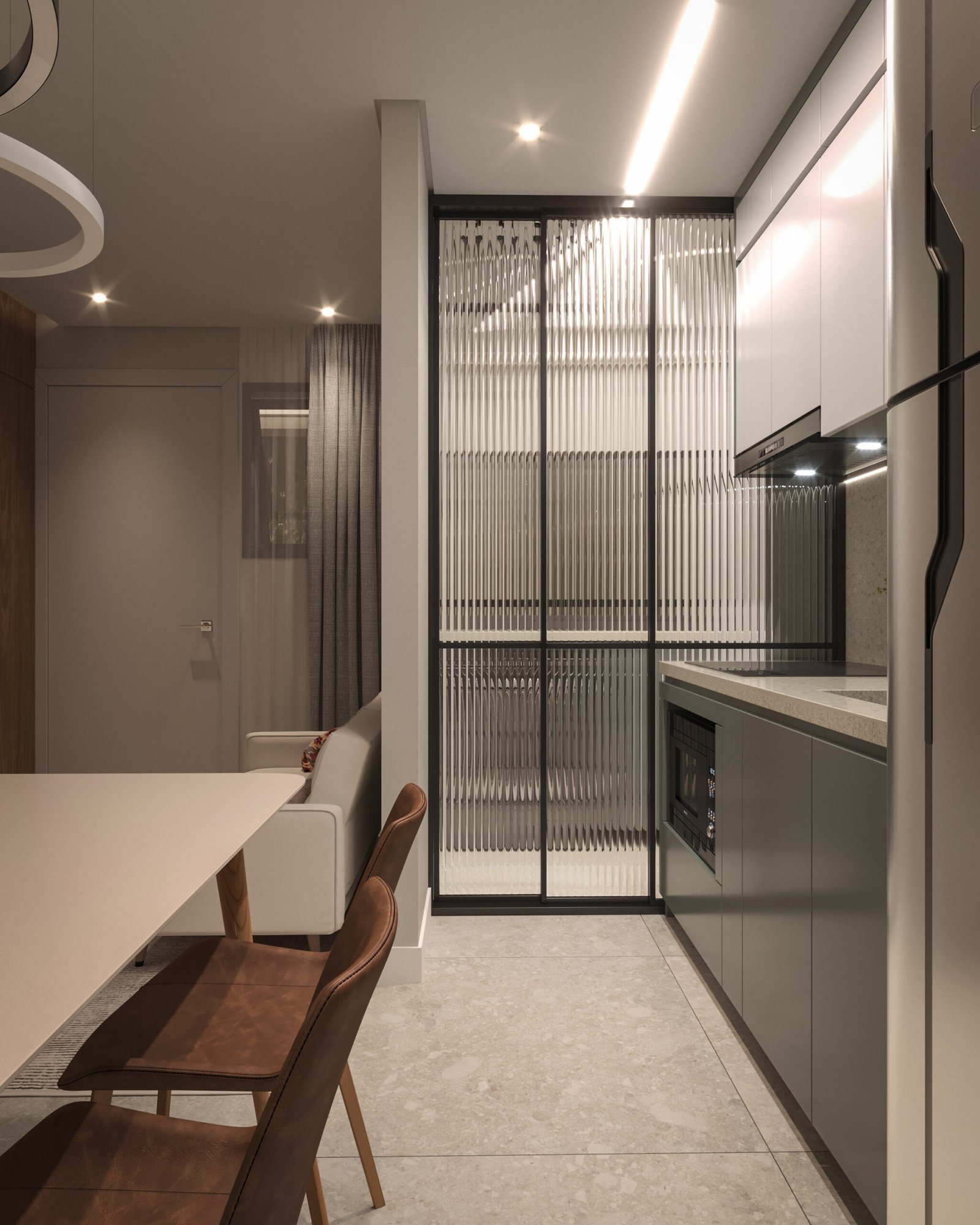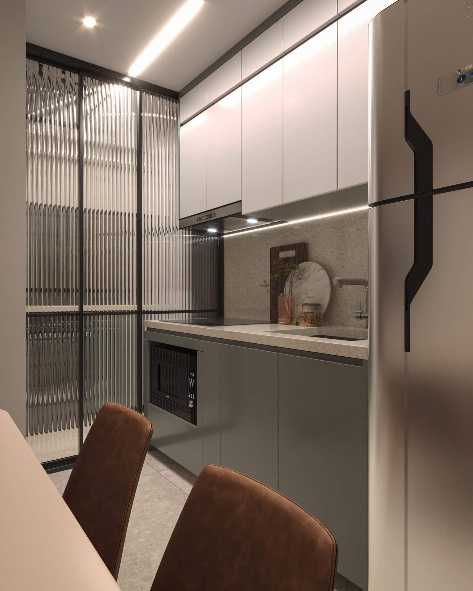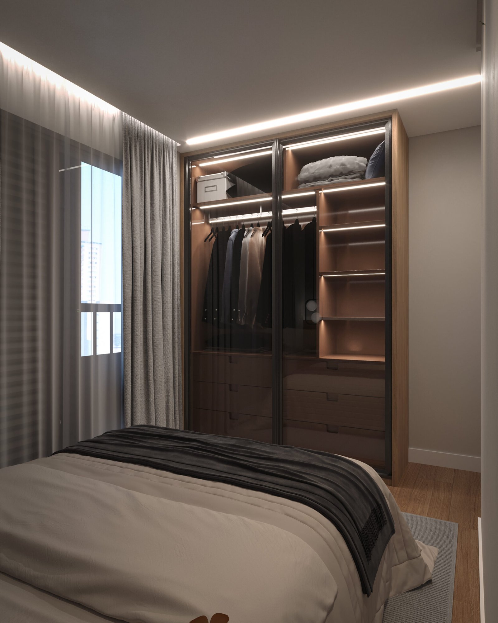 Nos interiores, com apartamentos entre 24m² e 35m², desenvolvemos ambientes confortáveis e bem resolvidos, preservando a proposta inicial do edifício. A ideia foi atender um público que valoriza a funcionalidade dos espaços compactos, com o toque contemporâneo do minimalismo urbano, perfeitamente ajustado às metragens reduzidas que caracterizam os lançamentos da Vila Mariana.